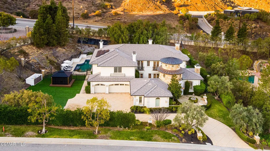 Discover unparalleled luxury in this 7,400 sq. ft. estate located in the prestigious gated community of Malibu View Estates, an exclusive enclave of just 17 custom homes. Nestled on over an acre, this 5-bedroom, 6-bathroom residence offers elegance, privacy, and breathtaking Santa Monica Mountain views.Each spacious bedroom, including one downstairs, features its own en-suite bathroom, ensuring ultimate comfort and convenience. The gourmet kitchen is a culinary masterpiece, equipped with Viking appliances, a large center island, ample storage and large walk in pantry. An open concept design seamlessly connects the living room, including a large quartzite fireplace flanked by custom built-ins, serving as a striking focal point. The expansive primary suite boasts a sitting area with cozy fireplace, balcony, custom walk-in closet complimented with a large second closet and a spa-like en-suite bath.Designed for both entertaining and relaxation, the resort-style backyard features turf, a sparkling pool with spa, built in bbq area, and stunning mountain views. A 5-car garage offers ample space for car enthusiasts, while the homes prime location offers easy access to the 101 and is approximately 12 miles to Malibu. The areas top-rated school district, Las Virgenes, makes it truly exceptional.Now is your chance to experience the pinnacle of luxury living!