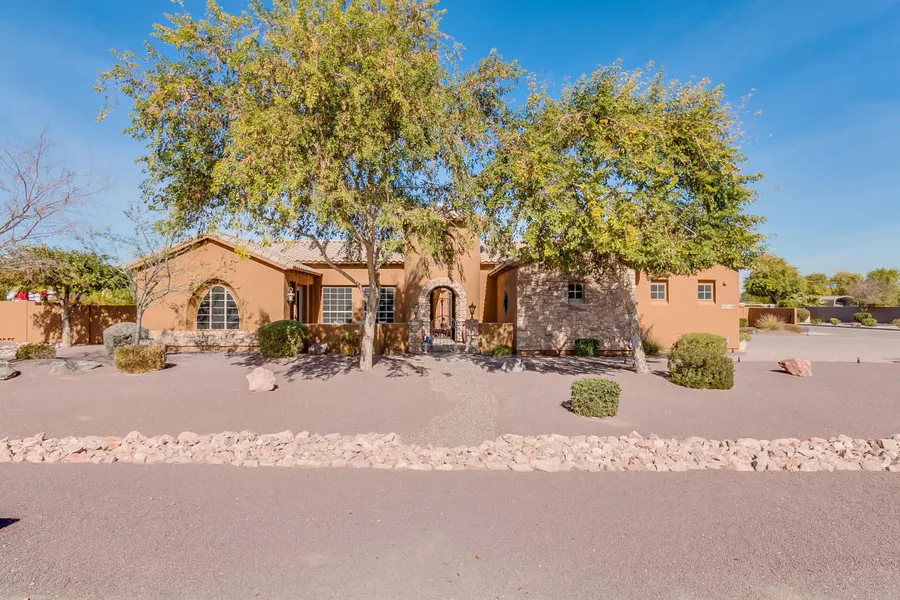 Extraordinary Santa Barbara style semi-custom home with private courtyard and two additional patios offers wonderful outdoor living experiences. This beautiful home is situated on over 47,000 sq. ft. lot. The community is gated. The heart of this home is a large gourmet kitchen with Viking appliances which opens to the formal dining room and great room. The home is built to accommodate informal family gatherings as well as large outdoor dinner parties. Home office has glass french doors which allows you to see the two sided fireplace. The game/workout room has a kitchenette and a view of the courtyard. All the bedrooms have an en suite. Additional parking area behind the RV gate great area to build an RV garage or casita. 70 panel solar system is owned.