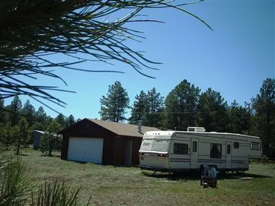 Parks Treasure! 1 acre with insulated garage, water cistern, septic, power, tall pines, easy access, county maintained roads and the seller is leaving the 1982 36' Holiday Rambler 5th wheel at no value. Seller is also leaving 2 riding lawn mowers, a 200 gallon water hauling tank an all this for under $150k. The garage is heavily insulated and sheetrocked. It just needs to be taped and textured. There is a wood burning stove that is included but needs to be hooked up. This unbelievable find is also in an area where there are wells.