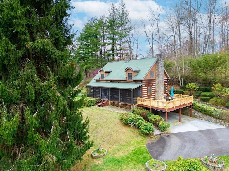 If a mountainlog cabinis what you're looking for with paved access & mountain views conveniently located between Sylva & Waynesville here it is. 3 bedrooms 3 baths on 1.09 ac. Various native wood constructionaccents this homes interior. Nativestone fireplaces. Rustic kitchen has anisland w/Jenn Air cooktop, 4 seat bar area & pantry. Separate diningroom off kitchen. Main level room was used as office/den area-could be converted back to a bedroom.Many updates to this home include: Bathroom updated in 2014 w/bath fitter shower, vanity & flooring ,Heat pump 2018 services main level & all of basement, new decking, & all exterior stained in 2024. 2nd level has 2 large bedrooms w/walk in closets-1 is primary w/updated full bath, double granite vanity, tile shower,& flooring, & heated with electric heat. Front and rear of the home have screened porches-handicap ramp on rear of home-Stone landscaping along driveway with mature shrubs & perennial plantings. Private well-Metal storage building-Man cave in basement w/ recessed lighting-surround sound-Covered parking- 9ft ceilings w/exposed beams. This home was well designed for comfort & enjoyment -Partially furnished.