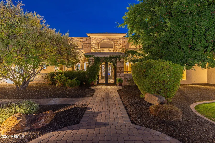 Welcome to luxury living in the prestigious Saddlewood Estates of Queen Creek, AZ. This exquisite residence boasts over 5000 square feet of opulent living space, featuring 4 bedrooms and 4.5 bathrooms. As you step through the double iron gates into the front courtyard oasis, you'll be captivated by the grandeur that awaits. Enter through the impressive glass and iron double doors into a stunning foyer, where elegance and sophistication converge. The meticulously designed floor plan unfolds, revealing a built-in office at the home entry, a separate den, and a formal dining room, offering both functionality and refined style. The east wing of the home encompasses the living area, kitchen, and secondary bedrooms, creating a seamless flow for entertaining and daily living. A guest suite inside provides privacy and convenience for your guests. The gourmet kitchen boasts not just two ovens, but two dishwashers as well! A gourmet dream to prepare and serve from this one-of-a-kind space with high end appliances to match. The "west wing" of the home is a true sanctuary, housing the Primary retreat. This oversized room offers a private courtyard and direct access to the backyard. The primary bathroom is a spa-like haven with an open shower and a separate soaking tub, creating a tranquil retreat within your own home. Step outside to discover a backyard oasis designed for relaxation and entertainment. The pool and spa beckon you to unwind, while the one-of-a-kind firepit steals the spotlight with both gas fire ring and wood burning capabilities. The sunken outdoor kitchen adds another layer of luxury, making outdoor gatherings a delight. The attached 4 car garage (which has held 5 cars at once) will blow you away all on its own but the detached garage is a car enthusiast's dream, with space for an RV and two additional cars. This versatile space can be transformed into a guest house or pool house, as it is already equipped with full electric and plumbing. The garage also boasts its own full bathroom, an interior 50amp plug, and an exterior 50amp plug, providing endless possibilities. While the home is allowed to have horses, it is not currently set up for it. However, there is space in the yard to add horse features and has private access to the neighborhood trail whether you are riding a horse or walking your pup. Experience the epitome of luxury living in this Saddlewood Estates masterpiece.