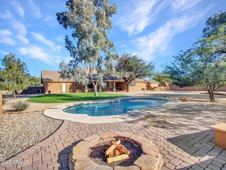 A rare Desert Hills opportunity: Supported by Cave Creek water, one acre, fully fenced, and thoughtfully updated for low-maintenance living. Interior finishes include porcelain tile with stone inlays, an open floor plan, and a renovated kitchen featuring slab granite and new appliances. Outdoor amenities comprise a pool, integrated BBQ, beehive fireplace, and raised garden beds. A detached ~1,980 SF garage (buyer to verify) offers extensive flexibility for vehicles, storage, or workshop use. Fire district protection, and a new septic tank, this property delivers both comfort and utility.