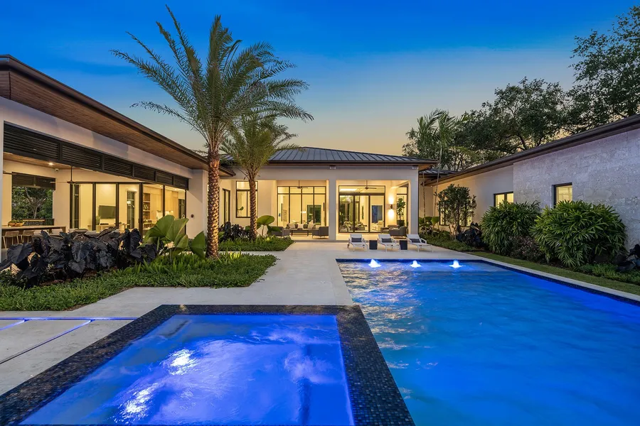 Experience the epitome of luxury in this impeccable 2023 tropical modern estate, meticulously crafted for immediate occupancy. Nestled on over an acre of pristine Pinecrest land, this magnificent residence proudly presents 7 bedrooms and 9 bathrooms, including a separate guest house with its own entrance and garage. Step into an extraordinary floorplan that unveils a chef's dream kitchen with state-of-the-art appliance, accompanied by a wine cellar and a wet bar. The master suite indulges you with a sitting room and a spa-like bath with a soothing soaking tub. Delight in panoramic outdoor views, highlighted by a resort-style pool, an inviting infinity spa, a covered terrace, a summer kitchen, and a sprawling yard. Additional features include maids' quarters, generator, Creston automation, mudroom/laundry, and 1-year builder's warranty.