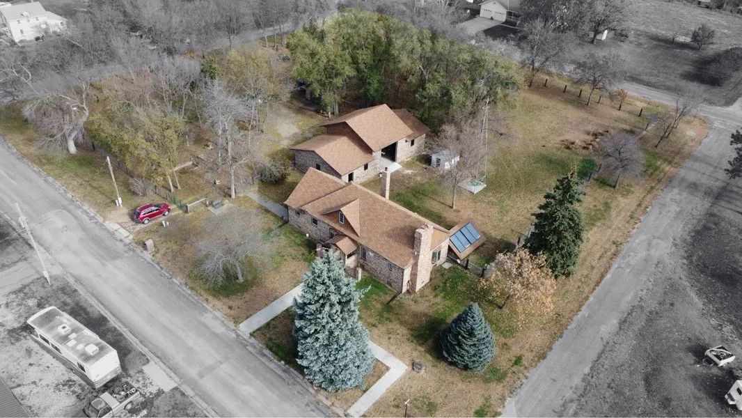 Own an Acreage in Town! Own 1.3 Acres and this solid brick 2 bed 2 bath home with detached 30' x 60' all brick garage. Updated shingles and heating system. Features electric (solar backup power) and wood heat with a wood fireplace on the main floor and a bonus wood burning furnace in the basement. Main floor bathroom has a jacuzzi tub. The 30 x60 garage features 3-stalls with 1 drive-through style garage (garage doors not yet installed) with space for vehicles, storage, or a workshop. The entire CITY BLOCK lot is completely fenced in! Current zoning permits a second home may be built on the property. A rare chance to own an entire block in town with room to expand or build. Disclosure: Images have been digitally decluttered for marketing purposes.
