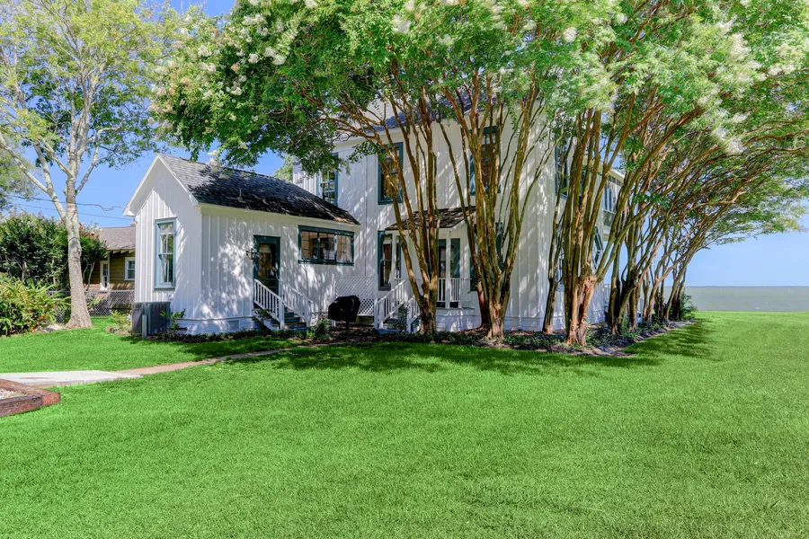 Absolutely charming home sitting directly on Galveston Bay. This home, built in 1918, was extensively updated in 2021 with the finest of finishes. Original hardwood flooring and shiplap walls lead the way. The living area boasts dramatic views of the yard and bay. The kitchen truly shines with an extra tall ceiling, beautiful cabinetry, quartz countertops, and custom lighting. Fabulous 6-burner gas range with a griddle and double ovens. Abundant cabinet and counter space. Upstairs you'll find three bedrooms and a wonderful screened-in porch offering serene views of the waterfront. Bathrooms here have been tastefully updated and feature walk-in showers. True relaxation begins the moment you step out the door. Relax on the porch, entertain family and friends, play on the grassy lawn, and watch the ships go by in the distance. Enjoy your own, private, beachy waterfront at this wonderful get...