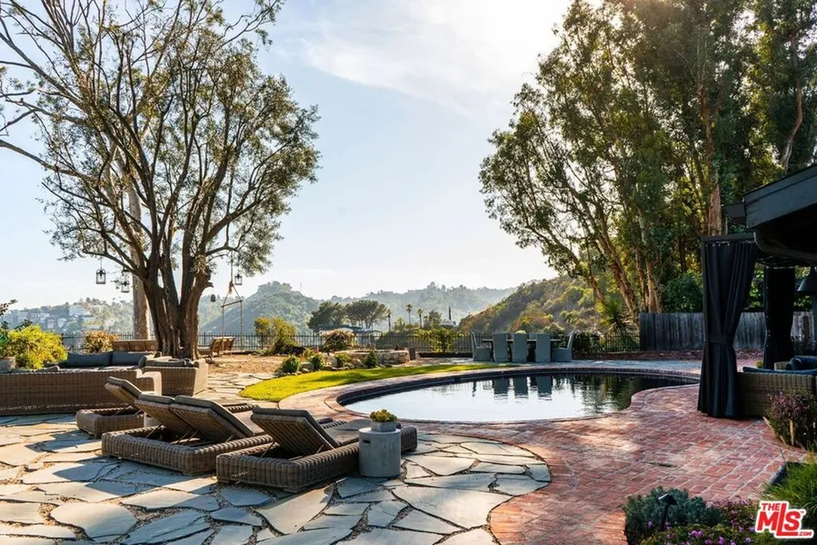 THE RAREST OF PROPERTIES. 1.2 exquisitely maintained acres in the prestigious Woodstock Rd. neighborhood. This California ranch meets the French countryside oasis is surrounded by captivating 360 degree views of canyon vistas and glimpses of city lights at night. Up the tree-lined gated driveway you'll find the charming main house featuring inviting interiors which include open beamed ceilings, wood floors and a charming brick corner fireplace in the living room. The ultimate in indoor/outdoor living, this bright and airy home is perfect for entertaining and seamlessly flows out onto the covered patio which overlooks the pool, fire pit and majestic olive tree. A secluded master suite that opens to a private patio which steps lead down to the Koi pond/Spanish garden and full guesthouse with own entrance -- a private retreat with beamed ceilings -- perfect for a media/game room/getaway. Ge...