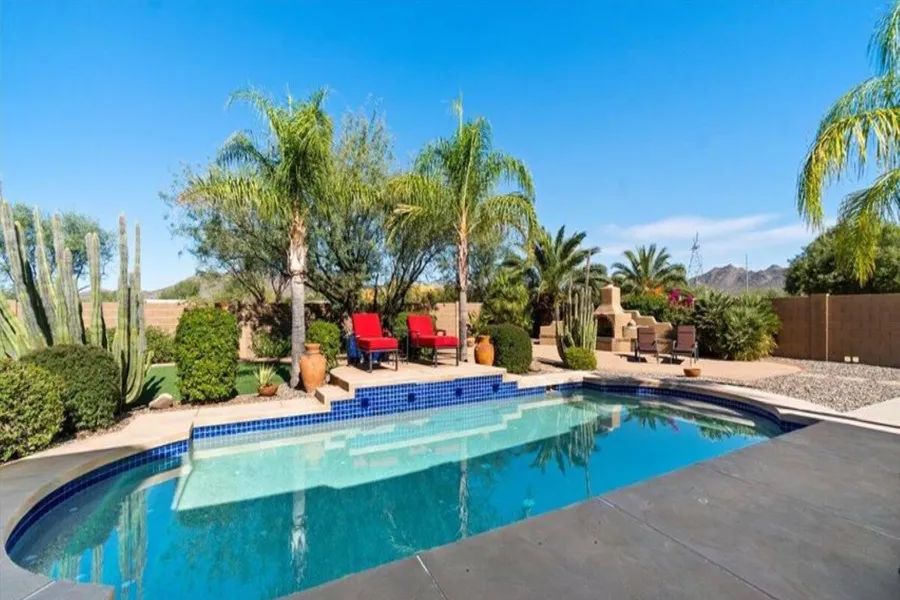 *** 3D Walk Through Tour Available In Photos*** Custom territorial home on over an acre of land at the end of a Cul-De-Sac. Backyard is landscaped including pool, citrus trees, large covered patio, fireplace, BBQ and room in the back for horses with mountain views! View photo #28 to see full property. Room for horses is behind the fence. Den is setup with built in office furniture. Primary bedroom offers patio access, fireplace and a large walk in shower. Kitchen is open to the living room and flows perfectly with the dining room. All furniture is available on separate bill of sale.