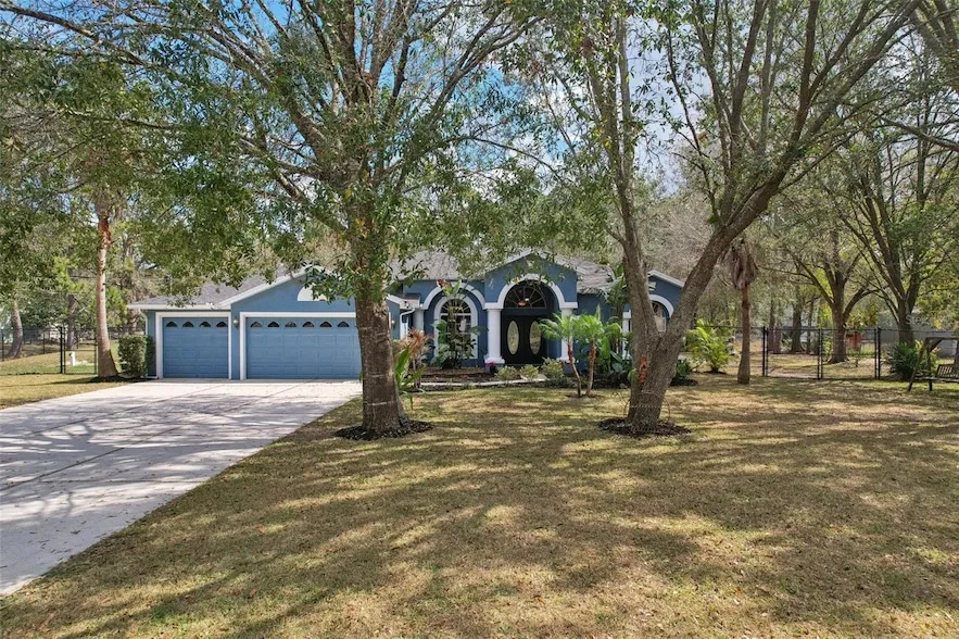 OVER AN ACRE OF LAND!!This beautiful 4-bedroom, 3-bathroom home with a 3-CAR GARAGE offers a perfect blend of comfort and privacy with NO HOA and NO CDD!! The home features a spacious split floor plan, with a formal living room and dining room, in addition to a cozy family room perfect for both entertaining and everyday living. The master suite is a true retreat, offering sliders that open to the lanai, crown molding, and DUAL WALK-IN CLOSETS. The ensuite bathroom includes a luxurious GARDEN TUB, a large walk-in shower, and plenty of space for relaxation. Throughout the home, you'll find gorgeous BAMBOO WOOD FLOORING, while the kitchen, bathrooms, and laundry room are beautifully appointed with ceramic tile. The 3rd bathroom conveniently provides direct access to the lanai and pool area, enhancing outdoor living. Step outside to enjoy the covered and SCREENED-IN LANAI, where you can relax by the sparkling saltwater, HEATED POOL. The backyard is fully fenced, offering privacy and a perfect spot for entertaining or simply unwinding around the fire pit. Enjoy a peaceful, country-like setting with mature trees and landscaping, while still being just minutes away from shopping, dining, and major roadways like Hwy 54 and I-75. Plus, there are no HOA fees or CDDs to worry about! This home truly offers the best of both worlds: a private retreat with easy access to everything you need!