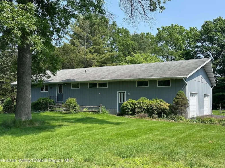 Rivka Estates, Blue Mountain. Three bedroom, two bath ranch on 1.1 acres. Well maintained home with cathedral ceilings in open living and dining area. Stone fireplace in the den with access to the back porch and deck. The large primary bedroom has oversized closet and full bath with stand up shower. Slate floors in entry foyer leads to tidy kitchen. Plenty of storage space in basement or in the oversized two car attached garage. Stone walls edge the level backyard with mature trees and bushes on either side providing privacy. This home has pond rights along with four other properties. Views of the Catskill Mountains to the west and a short drive to Village of Saugerties or Hunter Ski Area.