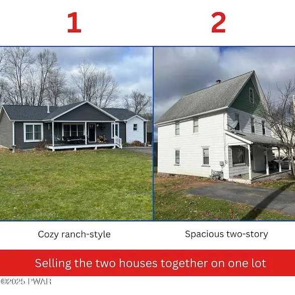 This property offers a unique opportunity for two dwellings on one lot, making it ideal for multi-generational living or rental potential. House #2 - An older house 3 bedroom one bath with large living area and good size kitchen built in 1875, House #1 Very fresh newer home 3 bedroom 2 bath ranch with a full unfinished basement built in 2017 forced hot air and AC, included with new house master bedroom with master bath, beautiful living area with gas fireplace, dining room and kitchen with a beautiful bar top island and stainless steel farm type sink, two other bedrooms with full bath and a good size laundry room. This combination of a newer home alongside an older residence provides flexibility and potential for various living arrangements or investment opportunities.