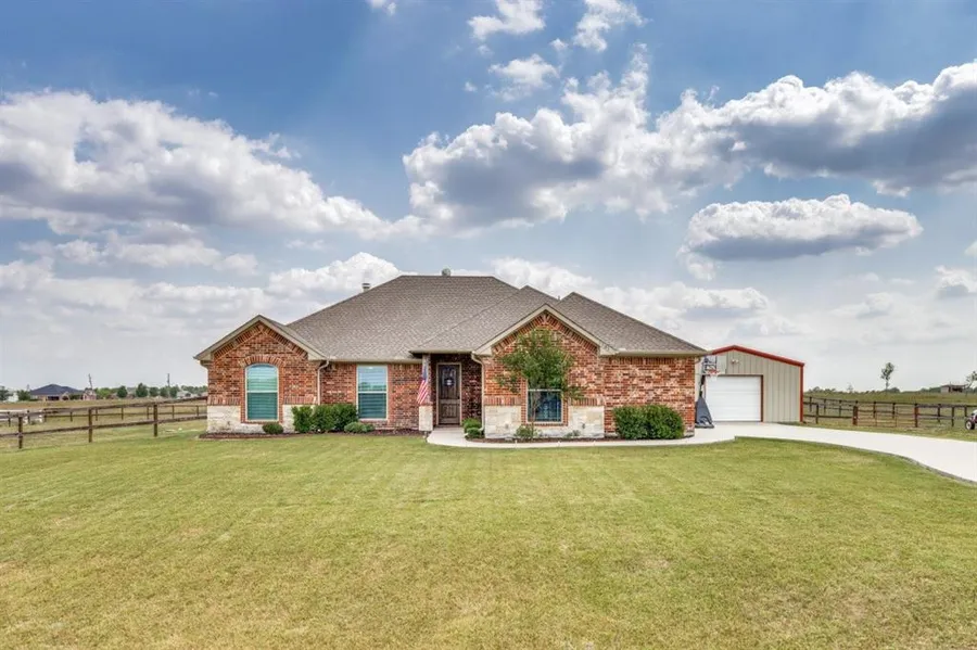 Nestled on just over an acre within exemplary Caddo Mills ISD, you'll discover refined country living in this stunning 4 bedroom, 2 bath beauty! Offering exceptional craftsmanship and modern amenities, this home is designed for those who appreciate quality and style. Step inside to hand-scraped hardwood floors that flow seamlessly through open living areas. The chef's kitchen boasts crisp white cabinetry, an oversized island with granite countertops, tumbled travertine backsplash, stainless steel appliances, and walk-in pantry. The spacious living room features a captivating wood-burning fireplace with a floor-to-ceiling brick and stone facade. Massive primary bedroom, ensuite offers dual sinks, soaking tub, large shower, and an abundance of natural light. The cozy secondary bedrooms are ideal for guests or additional space needs. Covered back patio is perfect for outdoor activities. Fully fenced, equipped with gutters and irrigation for added convenience. Insulated 24x30 workshop.