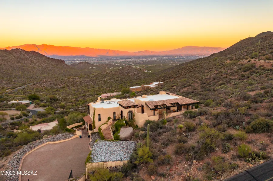 Distinguished mountainside residence in Trails End Estates, bordering Tucson Mountain Park, north of Gates Pass. This majestic marvel is perched on a high overlook - w/ breathtaking panoramic views in every direction (mountain, desert, city, sunrise, and sunset!). Indoor features include tasteful wood floors, spectacular wide windows, cozy gas fireplaces, updated kitchen (w/ quartz counters, breakfast-bar, & electric range), & expansive finished separate downstairs guest quarters with private entry, walk-in closet, & en-suite full bathroom. Outside, find serene sanctuary spaces & exquisite entertainment enclaves - impressive central court-style gates driveway w/ guard-booth, stunning veranda w/ terraced wrap-around patio & walkways