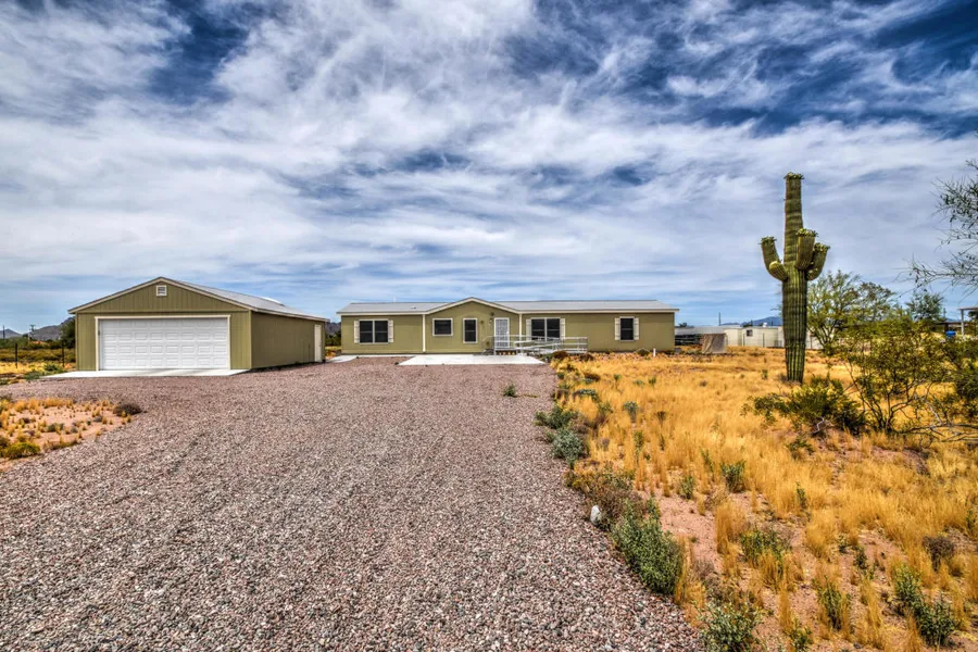 2017 Clayton home sitting on 1.25 Acres of Horse Property with breathtaking views of the Superstition Mountains. Some features include: 4 beds/2 baths, separate living, family & formal dining rooms, dual pane/low E windows, accent paint, kitchen island w/pantry, inside laundry, bay window in master suite, dual sinks, separate tub/shower with walk-in closet in master bath, secondary bedrooms also feature walk-in closets. Brand New 24'x32''Garage including 50 am 240v service, as well as RV Elec,water & waste hook ups. Brand new aluminum handicap ramps and rails for both front and rear entry.
