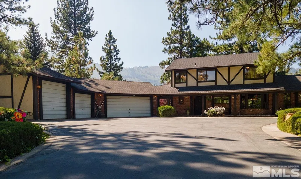 FORESTED NEVADA HAVEN!! SECLUDED TUDOR STYLE HOME approximately 250 ft East of California!! Custom built, original owner moving out of state. Views from every room!! Lots of natural light!! 1.12 acres!! Basement with recreation room, sauna, laundry room. Family room or mother-in-law quarters on second floor. Master on main floor with master bath. Oversized 4 car garage w/workshop area. Plenty of parking!! Easy freeway access to Reno (15 min's), Donner (40 min's), Lake Tahoe (60 min's).