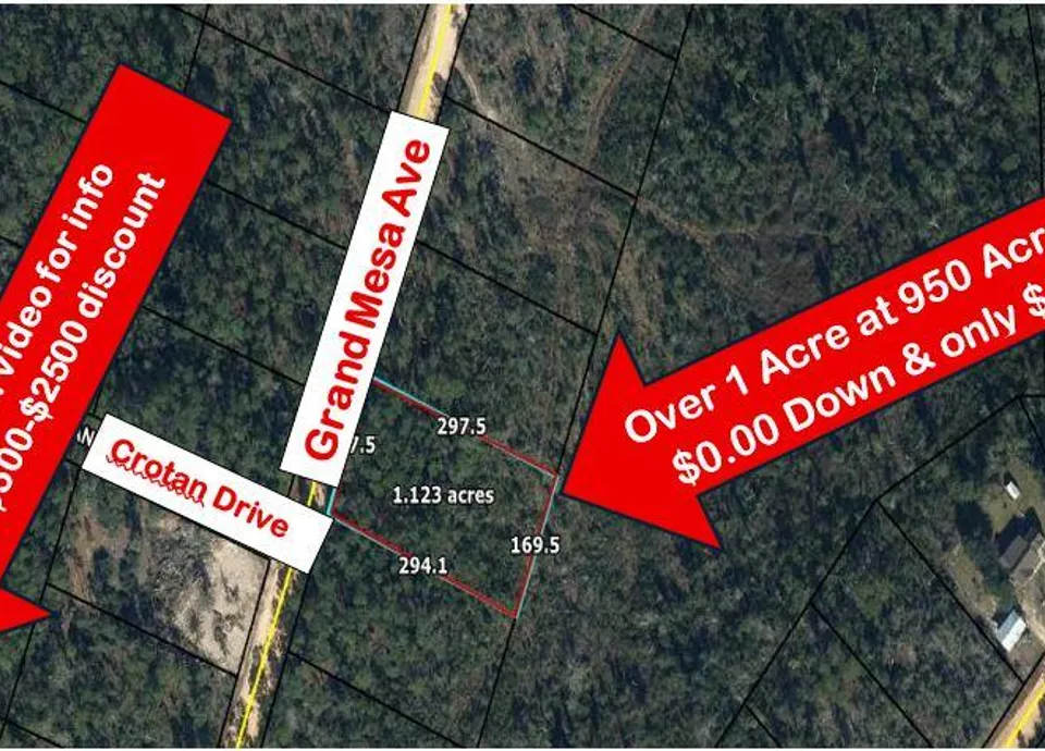 WHY SPEND $8,000 ON LESS THAN A QUARTER ACRE THAT OTHERS ARE OFFERING? YOU CAN GET MORE THAN A FULL ACRE AT THE HUGE LAKE COMPASS FOR $14,900 NO MONEY DOWN REQUIRED (that comes out to only $3725 per quarter Acre!) Owner-Financing full Acres for $14,900 with NO MONEY DOWN! Only $169 per month will buy it. Grand Mesa Ave, Alford, FL 32420( diagonally across the street from Crotan Drive as shown on map). The property is in Jackson County, Florida and is only 45 minutes north of Panama City Beach on the Gulf of Mexico and 1 hr 15 min west of Tallahassee via Interstate 10. Property is located 3 or 4 minutes from 950 acre Lake Compass for fishing, swimming, boating, jet - skiing, etc. Ask about our 3-year "Due Diligence" Land Exchange Program which our satisfied buyers have been taking advantage of for over 40 years!