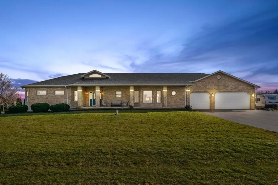 Nestled on a serene 1-acre lot, this stunning custom-built ranch home exudes charm and elegance. Boasting 2590 square feet of MAIN LEVEL living space, 4139 square feet of finished space, the residence offers a spacious and inviting ambiance. A highlight of the property is the expansive 5-car attached heated garage, complete with a 14 X 25 FT extra shop/storage space, providing ample room for vehicles, hobbies, and storage needs. Step inside to discover a welcoming vaulted foyer that sets the tone for the home's inviting interior. The layout includes a formal living room and dining room, perfect for hosting gatherings or transforming into a home office or classroom. The impressive family room features a full masonry fireplace, creating a cozy atmosphere and seamlessly connecting to the kitchen and breakfast area. The kitchen is a chef's delight, featuring birch cabinetry, an island, pantr...
