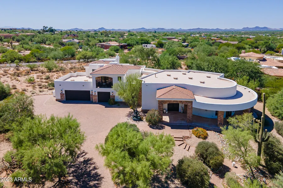 Ideal indoor/outdoor living in cowboy-chic Cave Creek, Arizona. Beautifully renovated home featuring mountain views and crimson sunsets in a lush desert landscape. Nestled near Black Mountain, this remarkable 1.13 acre estate epitomizes luxury living, blending architectural elegance, modern amenities, and stunning natural surroundings. Grand entry through double iron doors leads to the open living area. A curved wall of windows and French doors bathes the space in natural light and reveals Black Mountain's awe-inspiring view. A stone fireplace adds warmth, while Travertine floors flow to the dining room, featuring a coffered ceiling and Restoration Hardware chandelier. The 2021 fully renovated kitchen boasts an oversized island, white custom cabinetry, Taj Mahal quartzite counters, and Zellige Moroccan tile. High-end JennAir appliances grace this culinary haven, complete with a walk-in pantry, coffee bar and adjoining breakfast room. The main level presents two luxurious retreats. The primary suite offers hardwood floors, a two-sided gas fireplace, French doors to the patio and an organized walk-in closet. The spa-like ensuite, features a freestanding tub, glass enclosed shower, and dual vanities. The versatile first-floor guest suite, currently used as a den, has a beautifully updated ensuite bath and spacious walk-in closet. You'll find two additional guest bedrooms with walk-in closets upstairs plus a just renovated Jack-and-Jill bathroom. One of these bedrooms, used as an office, offers Black Mountain views and a balcony. The resort-style backyard is an oasis of relaxation and entertainment, featuring a covered flagstone patio, outdoor kitchen, just refinished heated play pool, oversized spa, water and fire features. The large pavered patio accented with desert landscaping sets the stage for al fresco dining, lounging, and sunsets by the stone fireplace in the sunken outdoor living area. Large main level laundry room and attached three-car garage with new epoxy floors (2023) plus substantial storage. And all of this offered in the small gated enclave of Canyon Crossings. DETAIL: Features & Updates Open Concept Living Room " Enter through full arch-top double entry ornamental wrought iron door which perfectly frames Black Mountain " Foyer flows into open concept living room with multiple Restoration Hardware chandeliers " Captivating Black Mountain views and cascading sunlight through the curved wall of windows and two French doors leading to covered front flagstone wrap-around patio. " Travertine floors and recessed lighting " Stone gas fireplace Formal Dining Room " Opens to the living room " Coffered ceiling " Restoration Hardware chandelier and recessed lighting " West and north facing windows " Art nook " Travertine floors Chef's Kitchen Full Renovation 2021 " Oversized island with warm wood-tone custom cabinetry, prep sink with Brizo faucet and disposal, plus breakfast bar with seating for four " Taj Mahal quartzite counters and handmade Zellige Moroccan tile backsplash adds texture and character " Custom white soft close cabinetry with copper hardware. Easy access spice drawer, utensil drawer, recycling bin and more for ideal functionality " Deep single sink with Brizo faucet and disposal plus large window overlooking resort style backyard " JennAir appliances 2021 - Refrigerator/freezer 2-door built-in with custom cabinetry finish and Obsidian interior (charcoal color) with LED lighting - Smart oven/microwave combination with dual fan convection - Professional grade six burner gas cooktop with Brizo pot filler and custom hood - Warming drawer with slow roast option - Dishwasher with custom cabinetry finish " Recessed lighting " Walk-in pantry with generous storage " Dry bar for coffee or cocktails with dual temperature beverage/wine refrigeration, open shelving and significant storage " Travertine floors Breakfast Room " Adjoins kitchen " Three windows flood the room with natural light and views to t