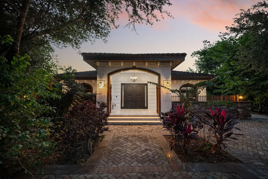 Welcome to your private Naples estate, a secluded and exceptionally unique 1.14-acre compound offering western exposure, unmatched convenience, and a rare multi-residence layout with no HOA restrictions or fees. Ideally located just off Golden Gate Parkway near Livingston, this gated property includes a grand 6-bedroom, 5.5-bath main residence, two separate one-bedroom, one-bath guest apartments with kitchenettes, a standalone gym, and resort-inspired outdoor living centered around an impressive courtyard. A rare, marble-finished driveway joins the private entry gate, impact doors and windows, newer HVAC system, whole-house generator, buried propane tank, and whole-house tankless water heater that delivers endless hot water to introduce the comfort, efficiency, and luxury this estate provides. Inside the main home, marble flooring spans the living areas, with warm wood flooring in the bedrooms and tile in the baths. Custom coffered ceilings, French doors, a fireplace, and a whole-home surround system further elevate the living experience. Four bedrooms sit at the front of the home, while the primary suite and sixth bedroom enjoy a peaceful setting at the rear. Expansive glass doors open to the courtyard, creating seamless indoor-outdoor living ideal for everyday comfort and entertaining. The chef's kitchen is exceptionally well-designed with both gas and electric appliances, granite countertops and backsplash, a stacked-stone accent wall, oversized island with sink, mounted main sink, stainless steel appliances including a gas range with pot filler, wall oven, built-in microwave, refrigerated drawers, wine cooler, refrigerator/freezer, and newer dishwasher. The primary bath offers a built-in massage table, soaking tub, dual sinks with makeup counter, and a luxurious five-showerhead walk-in shower. Two guest bedrooms include en-suite baths, and both a half bath and pool bath serve the main living and courtyard areas. The stunning screened courtyard is designed for year-round enjoyment with a heated pool, turf and travertine surround, and covered outdoor living with ceiling fans. The full outdoor kitchen features an Argentine grill, cooktop and griddle, deep fryer, refrigerator, bar area, and granite counters with matching backsplash—perfect for entertaining on any scale. Beyond the courtyard, the backyard becomes a private park with a peaceful pond, charming bridge, fruit trees, and multiple areas for quiet relaxation. A separate equipment building houses the water system. This exceptional Naples compound offers privacy, versatility, and true resort-style living, creating a rare opportunity for those seeking a one-of-a-kind estate.