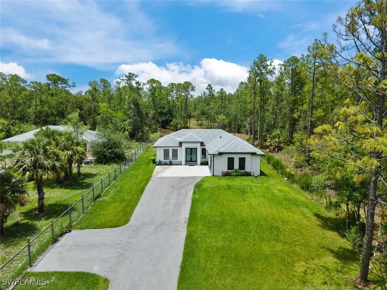 Brand-New Construction on 1.14 Acres in Golden Gate Estates No HOA!Experience the perfect blend of modern design and peaceful country living in this newly built 3-bedroom + den, 2-bathroom home, ideally located in the sought-after community of Golden Gate Estates. Nestled on a fully upland 1.14-acre lot, this property offers the space, privacy, and freedom to live life on your terms with no HOA restrictions.Step inside to discover an open-concept layout filled with natural light and designer touches throughout. The kitchen is a showstopper, featuring quartz countertops, a striking waterfall island, 42" wood cabinetry, a stylish backsplash, and stainless steel appliances. Enjoy high tray ceilings, elegant crown molding, and tile flooring throughout the home for a cohesive and luxurious feel.Built with quality and durability in mind, the home is outfitted with impact-resistant windows and doors, 8-ft interior doors, 6" baseboards, and an automated sprinkler system. The split-bedroom floor plan provides privacy and functionality, while the flex den offers endless options for a home office, playroom, or formal dining area.Outside, you'll appreciate the asphalt driveway, ample room to add a pool, guest house, or workshop, and the tranquility of your wooded backyard. With zoning that allows for horses, this home offers a rare opportunity to enjoy Southwest Florida's natural beauty without sacrificing convenience just a short drive to shopping, dining, and Naples world-famous beaches.Ready to move into your dream home in paradise? Schedule your tour today