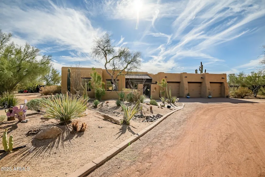 Nestled on a sprawling 1.1+ acre lot, this stunning Territorial-Santa Fe style home offers a unique dual-living setup, perfect for multi-generational families. Easy to maintain desert landscaping, the property features a resort-style swimming pool w/waterfall & slide, creating a true oasis. Inside, the spacious primary suite is a private retreat with sliding glass doors leading to the patio, a luxurious en-suite with a Jacuzzi tub, oversized shower, and a walk-in closet with a washer and dryer. The chef's kitchen is a dream, boasting a built-in refrigerator, eat-in bar, and ample prep space. While this home can accommodate two families, the split can be reversed fairly easily. This home blends comfort, elegance, & functionality in an unparalleled setting. No HOA.