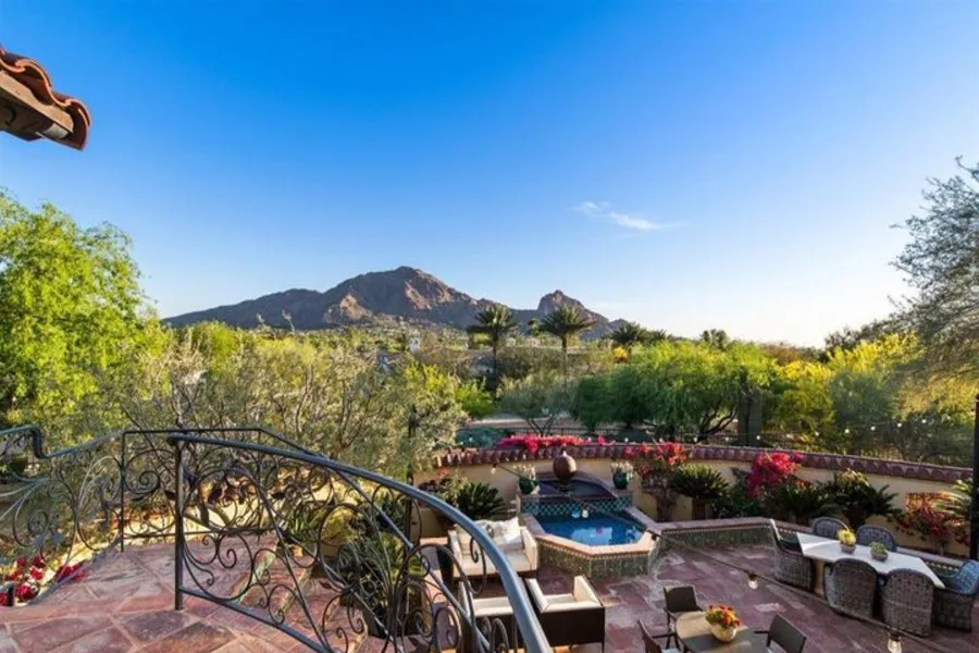 Timeless old-world charm amidst Mummy Mountain boasting striking Camelback Mountain views is this Spanish Colonial Revival Architecture home designed by Nostdahl Liptack Architects. Sophisticated craftsmanship went into every detail of this remarkable home. Dramatic entry into the formal foyer opens to an intricate circular iron stairway leading into the whimsical living room with beamed cathedral ceiling. Spanish architectural elements throughout including embellished tiles, elaborate tile rug, baroque curves and arches, adorning stained glass windows and of course a cantina! Enchanting indoors and outdoors with a harmonious resort-style ambience. Indoor features include four bedrooms, five bathrooms, formal dining, quintessential kitchen, and an exercise room. Outdoor features consist of