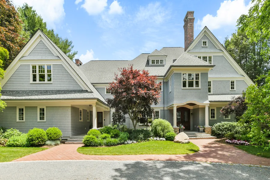 Sophisticated elegance throughout this New England shingle style home. Designed with fluidity of space, rich in millwork and set on over an acre of secluded yard gardens. The interior and exterior connect seamlessly through an impressive stone wraparound porch, patio and primary suite balcony. Smart Home Automation | Five entertaining rooms | five fireplaces | two home offices | study | library | five bedrooms | game room | fitness center | spa | three garage spaces. Tranquil views of private wildflower meadow and historic conservation land including trails, orchard and brook. Just blocks from town center.