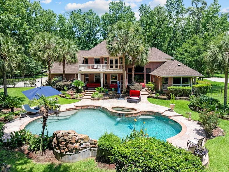 Nestled on 1.15 wooded acres in a private gated community, this home offers both space and serenity. The 3-car garage features custom built-ins an ideal setup for any hobbyist or handyman. Inside, you ll find wood and tile flooring throughout the main level, with carpet and tile upstairs for added comfort. The front yard showcases stunning landscaping with charming bridges and stone accents. A dual staircase adds a grand touch inside, while the backyard is a true retreat complete with a swimming pool to beat the Texas heat, a gazebo perfect for relaxing among the trees, and an upper-level deck off the game room where you can watch deer roam at dusk. With generous storage, scenic surroundings, and thoughtful details throughout, this home invites you to come take a look and fall in love with the lifestyle and community. New A/C, furnace, home generator, and filtration system are already in...