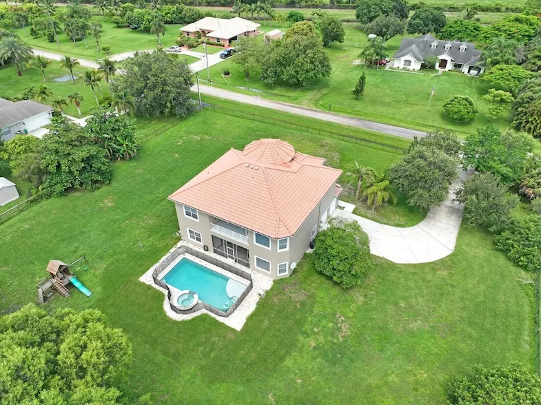 Impressive 2 Story CBS Home with 5 Bed/4.5 Bath/2 Car Garage pool home. Upon entering the front door it opens into a Beautiful Foyer w/ wide Circular Staircase, Formal Living and Formal Dining Room, Every Bedroom has its own bathroom, 1 bed and bath is on the first floor with separate entrance, Stainless Steel Appliances with countertop seating plus a breakfast nook, Kitchen features 42 inch upper Cabinets and Granite countertops, Upstairs features huge Master Suite as well as an Upstairs Balcony overlooking the private backyard. This Castle of a home sits on over 1 acre which is fenced and gated. Hurricane Shutter protection included. Freshly painted exterior with Brand new floors. Town of Jupiter City water.