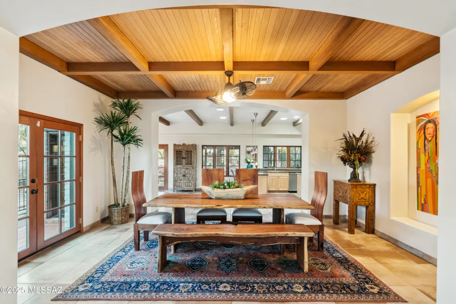 Set within the storied Harold Bell Wright Estates, 6510 E Marta Hillgrove is a rare offering that combines architectural heritage with refined living. The main residence, a southwestern contemporary custom built in 1995, features 3,745 square feet of elegant space. Upon entering the gated property, guests are greeted by ample parking adjacent to thoughtfully designed water features with Koi and goldfish. From there, a decorative wrought iron gate leads into a tranquil courtyard. Inside, soaring ceilings with exposed wood beams create a light-filled atmosphere, while the living room's fireplace and formal dining room invite both relaxation and entertaining. The kitchen is designed for culinary enthusiasts, with a large island, double ovens,