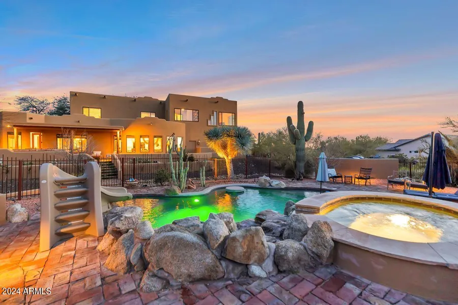 It is time to make this amazing home your own! This exceptional custom-built 4445 sq ft estate boasts a gorgeous main home accompanied by a full guest home. The spacious one-bedroom guest home is strategically positioned on the property, providing separate living quarters complete with its own private driveway, single car garage, full bath, eat-in kitchen, laundry room and covered patios, catering ideally to multi-generational families, guests or renters as an income generating entity. This separate property offers unique and convenient passive income via AirBNB, with earning potential of up to $5000 per month during peak season. You will enjoy a wonderful pool and spa for play, relaxation or enjoying Arizona's spectacular sunsets! Comfort awaits with the Newer HVAC's on the main home... with solar. The captivating main residence features 4 bedrooms, 3 full bathrooms, a private executive office, and breathtaking views of Black Mountain and the Boulders. As you step into your dream home, you're greeted by a picturesque front courtyard adorned with custom iron gates, two outdoor fireplaces and a striking fountain. Inside, the home boasts an inviting open floor plan with rich wood flooring, beamed ceilings, and NEW custom oversized windows that frame the stunning mountain vistas. The kitchen, a chef's haven, showcases Quartz countertops, a Subzero refriderator/freezer, stainless steel appliances, stylish cabinetry, and a GE Profile oven with a center island induction cooktop. The spa-inspired master ensuite offers dual sinks, a separate soaking tub, and shower, ensuring a luxurious retreat. Outside, the sprawling resort-style backyard is an entertainer's paradise, featuring a covered patio, built-in BBQ space, bar seating, and a second Kiva fireplace. Overlooking a beautifully gated, pool, spa, Baja shelf and rock waterfall, the outdoor space offers mesmerizing mountain views, complemented by custom hardscapes, lush landscaping, and extensive stone walkways, inviting you to explore your desert sanctuary. This is a must see!