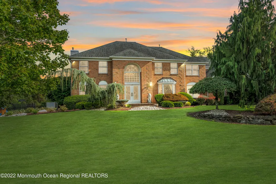 This magnificent colonial-style home set in a peaceful Freehold neighborhood offers everything needed for a tranquil lifestyle. Displaying a stately brick exterior and surrounded by greenery with a paver driveway leading to a 3 car garage. Electric bills are little-to-none with the super-efficient, energy-saving solar system and a backup generator. A handsome staircase in a two-story foyer with an elegant chandelier makes an impressive entry. A chef's kitchen flows openly to the family room and backyard patio. Upstairs boasts a grand primary suite with a sitting area, an elegant room-size closet w/chandelier, a luxurious ensuite plus a bonus room perfect as a workout room or nursery. The resort-style backyard will surely take