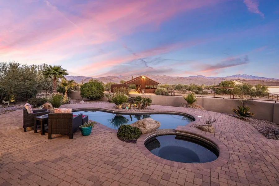 This beautiful, recently updated, property is ideal for outdoor living at its best. Unparalleled in design, this light & bright open floor plan is nestled on almost 2.4 acres of professional desert landscape complete with amazing mountain views, gorgeous sunsets & miles of trail riding. With 3410 sq/ft of meticulously maintained space, entertain all of your guests in large & open public spaces that spill out into your resort-style backyard, heated pool & spa, overlooking the most charming custom rustic barn/workshop. The high ceilings & large windows bring the views of the natural desert & four peaks right into your living space along with a split floor plan with master retreat & three additional bedrooms. Huge garage with storage area and owned solar used for water heater.