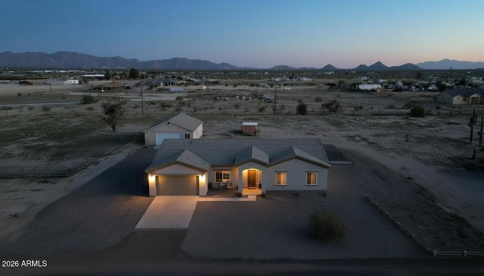 Welcome to your ideal desert retreat! This beautifully updated 4-bedroom, 2-bath home sits on over an acre, offering modern comfort with rural freedom. The open-concept layout showcases a gourmet kitchen with quartz countertops, white 18'' cabinets, large sink, stainless steel appliances, and wood-look tile plank flooring throughout. Bathrooms feature tiled showers, granite sinks, updated fixtures, and two-tone paint with 3-inch baseboards adds a refined touch. The property includes a 30'x40' detached 4-car garage, Tuff Shed, covered patio, and shared well on site. Plenty of room for RVs, toys, and horses this property truly has it all.