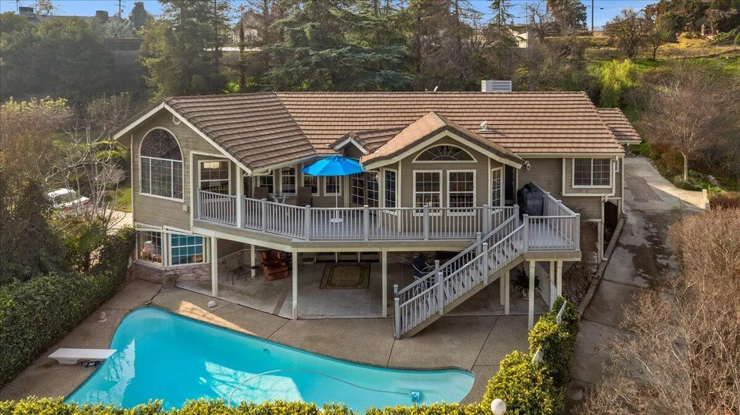 Nestled atop a scenic hill, this breathtaking 3-bedroom, 3-bathroom, 2-story home offers incredible views from every room. Spanning on 1.15 acres which includes the additional lot. Soaring ceilings and large windows fill the home with natural light in the living room. The gourmet kitchen is the heart of the home, boasting a double oven, state-of-the-art induction cooktop, a large center island and additional breakfast bar, abundant cabinetry, and a walk-in pantry that will exceed your storage needs. Whether hosting dinner parties or preparing everyday meals, this kitchen is designed for both function and elegance. A formal dining room perfect for gatherings. All three bedrooms offer walk-in closets. Enjoy a spacious primary suite with access to the expansive deck to enjoy morning coffee or evening wine. Also features an oversized ensuite equipped with a separate soaking tub, walk-in shower, and double sink vanity, creating your own private oasis. Lower level has a great room overlooking the patio and pool. With additional bedrooms and a laundry room. Walk outside to the low-maintenance saltwater pool with a new variable speed pump and recently replastered. Includes a convenient pull-through garage, ideal for extra vehicles, equipment, or recreation. Don't miss your opportunity to own this exceptional hilltop retreat, Schedule your showing today!