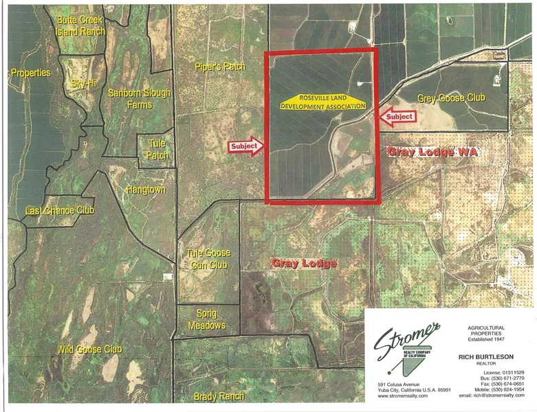 LOCATION: The Roseville Land Development Association rice property and waterfowl hunting club was established in 1927. From Gridley, California head west seven (7) miles on the Gridley-Colusa Hwy to Hatch Road. Turn south on Hatch Road one (1) mile to the property. The property is adjacent to the northwest corner of the State of California Graylodge Refuge and is bordered on two sides by the Graylodge Waterfowl Sanctu...