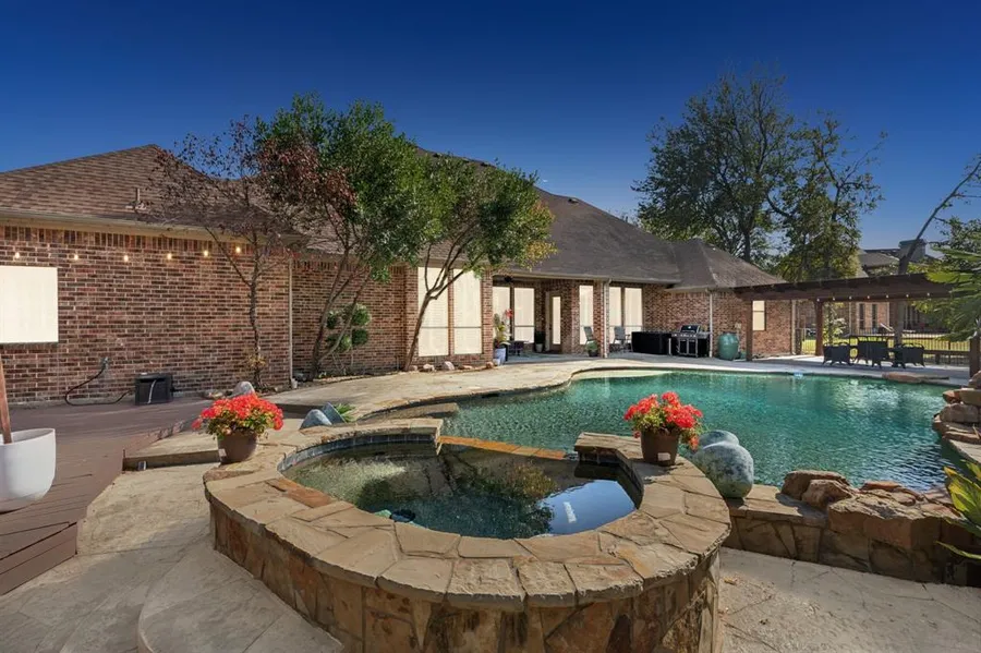 Experience the height of elegance with this 4-bedroom, 6-bathroom custom home boasting a rare 6-car garage. This exquisite residence sits on a picturesque wooded corner lot, delivering unmatched curb appeal with its lush lawn, towering trees, and impeccable landscaping. Step through grand double doors into a sweeping foyer, showcasing rich hand-scraped wood floors, crown molding, and intricate custom details throughout. The heart of this home is a chefs dream kitchen, featuring an expansive island, generous breakfast bar, and abundant storage, seamlessly flowing into a sunlit family room with stunning backyard views. The master suite serves as a serene retreat with a sitting area, luxurious walk-in shower, separate vanities, and a spacious walk-in closet. A game room and additional bedroom with a full bath await upstairs. The outdoor paradise includes a heated pool, hot tub, arbor, deck ...