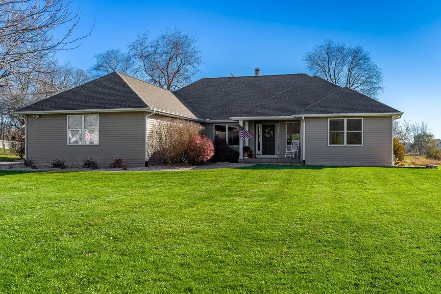 Custom built ranch on over an acre that is over 2,100 square feet with four bedrooms and 2 full baths on the main floor! Outside is quite the retreat you want to take in with a large patio space, pergola with fireplace, and woodburning fire pit overlooking your vast backyard! Inside is light & bright and features a contemporary floor plan. The great room, dining room, and kitchen open up to each other. The kitchen is stunning with custom cherry cabinetry, granite countertops, and stainless steel appliances! The primary suite is very spacious with a large en suite bathroom complete with whirlpool tub, double vanity, and custom tile work! The primary suite does come with a private three season porch that you can enjoy throughout the year! There are three additional bedrooms with a hall bath that has a custom wall tile tub surround. The first floor also features a true laundry room with ple...