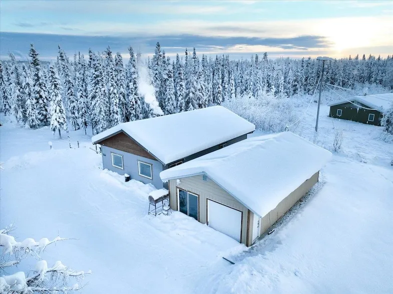 Welcome to a property that offers both comfortable living and built-in income potential, all set on a spacious 1.24-acre lot with room to breathe. The main home features a bright, open-concept layout where the kitchen, dining, and living areas come together under vaulted ceilings, creating an airy and inviting atmosphere. A large quartz-topped island anchors the kitchen, making it a natural gathering place for meals, conversation, and everyday life. Updated laminate flooring flows throughout, and the home includes three well-sized bedrooms and two bathrooms, including a private ensuite in the primary bedroom. A dedicated laundry and utility room, generous closet space, and a crawl space provide practical storage solutions that make daily living easy. Adding even more value is a separate two-bedroom, one-bath rental unit with approximately 800 square feet of living space, included in the total square footage. This secondary dwelling has a strong rental history and is heated by a Toyo stove, making it an excellent option for supplemental income, extended guests, or flexible use. Outside, the expansive lot offers privacy and versatility, along with a storage shed for tools and outdoor gear. Conveniently located with easy access to both Fort Wainwright and Eielson Air Force Base, this property blends space, functionality, and opportunity into one compelling package.