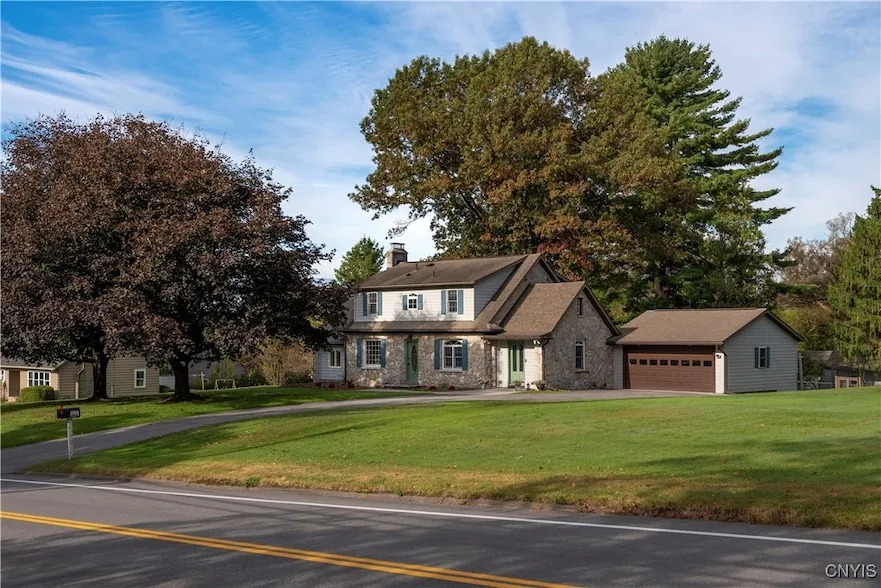 This beautifully renovated Cape Cod home seamlessly blends classic charm with modern upgrades. Nestled on 1.2 acres, the property features lush landscaping, including two majestic maple trees providing shade and privacy. With 3 bedrooms, 2.5 baths, and a finished basement, the home offers ample space and comfort. The cozy living room boasts a wood-burning fireplace, while the entire home benefits from radiant floor heating and multi-zoned air conditioning. The gourmet kitchen is a chef's dream, showcasing custom cherry cabinets with elegant triple crown molding, quartz countertops, a spacious island, and a 4-person peninsula. High-end appliances include a Wolf gas range with griddle, a convection oven, stainless steel hood, and a Grohe pot filler. Outside, two recently refurbished carriage houses sit amidst a sprawling lawn, with the peaceful sound of a nearby creek. A charming blu...