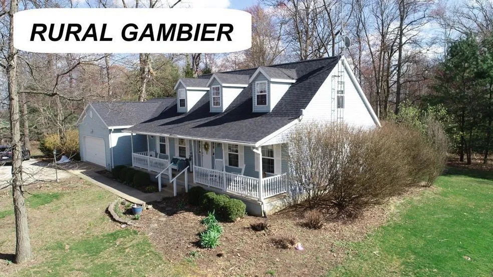 RURAL GAMBIER, in the rolling hills of Knox Co. Nestled among majestic oaks and backing up to a woods full of deer and wildlife, This charming single-family home across from wide open fields. In addition to deer, turkey and squirrels, you'll see an occasional bald eagle cruising above the nearby Kokosing River. Located between Gambier & Mount Vernon, this home gives you easy access to Kenyon, MVNU, Ariel and within 30 minutes of the Johnstown/New Albany Tech Campus. This one-owner Cape Cod has 3BR, 2.5 Bath, a bright solarium and huge low-maintenance vinyl deck. 1st FLOOR MAIN SUITE & 1ST FLOOR LAUNDRY. Large unfinished LL with extra block height, 2250 sq ft, NEW ROOF, 1.2 acre lot, storage shed, raised garden beds, fireplace, gas powered Generac generator, High Speed Internet & Cable through Spectrum fiber optic, Updated furnace & HW tank. Located close to kayaking on the Kokosing or peddling or walking on the Kokosing Gap Trail. Mt Vernon Schools. Includes a 1 Yr Home Warranty.