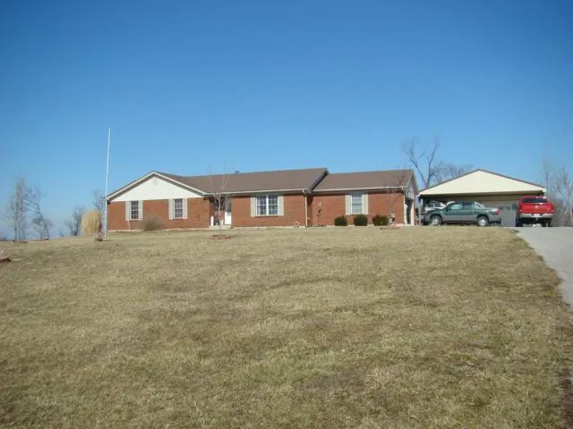 Brick Ranch Home! Lots of storage space with 2 car attached garage plus detached 20x32 metal shop/garage bldg. 3 B/R's, 2 full baths, huge open L shaped kitchen, dining, & living room w/ cozy fireplace. Includes above ground pool, all on 1.2 acre country lot w/ view of farmland.