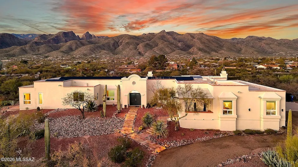 Custom home on 1.21 acres in the Tanque Verde Valley. The Catalina Mountains provide spectacular views from nearly every room. The property features a negative edge Pool & Spa, covered patio, and a desert tortoise enclosure. Watch sunrises & sunsets from multiple patios. Inside you have 4088 sq ft designed perfectly for a large family or multi-generational living. The home has 4 bedrooms and 3 bathrooms & the Guest Quarters adds 3 more bedrooms and 1 bathroom. Guest addition includes living area, kitchenette & separate patio entrance. On an elevated lot with McDonald Park to the west and no home to the north. You will appreciate the OWNED Solar System installed 2023, newer windows, steam room and so much more. Walking trails & proximity to the park make it perfect for outdoor activities.