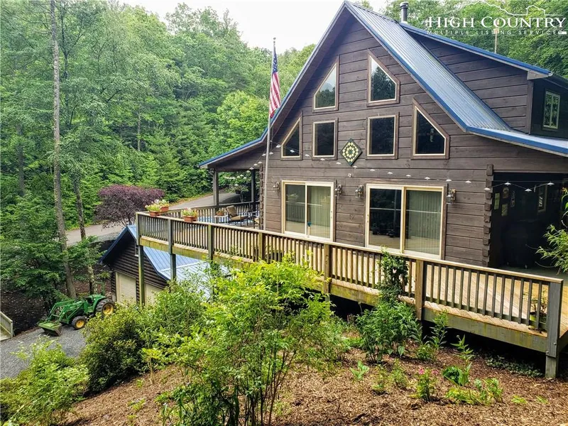 BEAUTIFUL, UNIQUE MOUNTAIN CABIN !!! This exquisite 3 bedroom, 3 and a half bathroom home, located centrally between Boone and West Jefferson is the perfect mountain getaway! Nestled in the woods, in a beautifully maintained subdivision, this home has it all. No detail was overlooked! From the special order hammered copper sink, the tongue and groove throughout, red fir beams, to the central vacuum system, this home is truly a must see. This spacious mountain home offers three separate living spaces, two laundries, as well as two kitchens and tons of outdoor living and entertaining space. The attached carport offers parking for four vehicles and the detached two car garage is the ideal workshop. On cold mountain nights, cozy up next to the fire or relax in the hot tub. On warm summer days, unwind on the wrap around deck that is perfect for grilling and family get togethers. Enjoy your morning coffee by the rolling mountain stream. Whether you are looking for part-time mountain getaway or a full time home with a rental income space this home offers it all!!