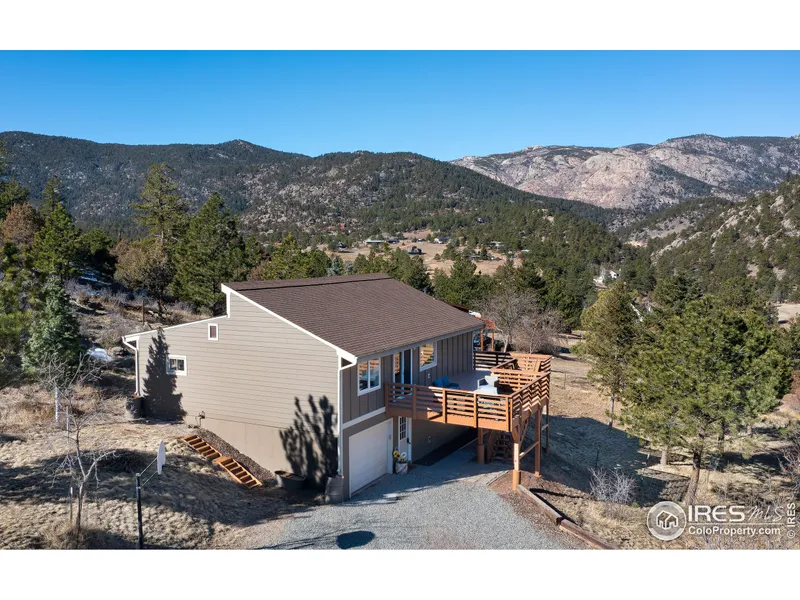 Discover the charm of Pinewood Springs in this beautifully updated mountain retreat, offering sweeping views of the surrounding forest. This thoughtfully designed home blends modern elements with a mountain personality. The bright, contemporary kitchen features an expansive island, high ceilings, and large windows that flood the space with natural light-perfect for both casual living and entertaining.The lower-level walkout provides a versatile living space, including a cozy living room, guest bedroom, and direct access to the attached garage and spacious utility/laundry area. The home's warm and inviting atmosphere extends to the large deck, where you can relax and take in the breathtaking scenery.Fire mitigation efforts and a newer roof with the highest fire-resistant rating ensure peace of mind. The exterior is wrapped in noncombustible James Hardie board siding, offering durability and energy efficiency. An attached one-car garage and garden shed provide ample storage for outdoor gear.With no HOA, Pinewood Springs residents enjoy unique amenities, including a rural water system and year-round road maintenance through county tax districts. The community also enjoys a unique private swimming hole on the Little Thompson River, ideal for summer relaxation. Roosevelt National Forest surrounds the neighborhood, offering endless opportunities for hiking, mountain biking, and wildlife viewing.Conveniently located just 10 minutes from downtown Lyons, 20 minutes from Estes Park, and 30 minutes from Boulder and Longmont, this property offers the perfect balance of seclusion and accessibility. Experience the best of Colorado mountain living with modern updates and unparalleled natural beauty.