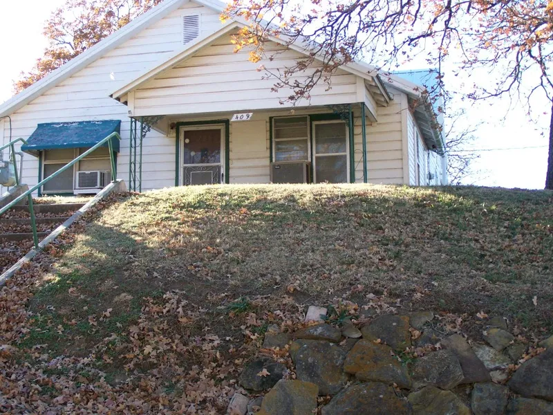 House on 1.23 acres in city limits, on a hilltop built approximately 1952. 2 bedrooms, 1 bath spacious kitchen with room for a dining table, has gas cook stove, ample cabinets (refrigerator belongs to renters). Nice sized living room, wall furnace and window unit for air. Attached carport, house has metal roof, white siding, utility room, equipment shed, nice building set up with smoker inside (had fire so wiring is non working)