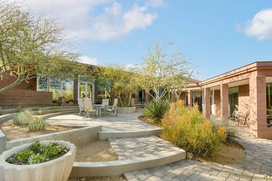 On the Edge of a Mountain Preserve. Secluded, Serene Sanctuary. The architecture celebrates the special qualities of the property. Primary bedroom, family, kitchen, dining, living, office, relate to each other in a linear sequence on a single level that integrates with the natural landscape, following the contours of the desert. The plan orientation allows natural light to flow from both sides to all the main spaces under the metal butterfly roof that lifts to reveal the mountain preserve peaks as well as the distant city lights on the north horizon, Comfortable guest rooms embrace a large but private front courtyard,, A spacious three-car garage, with direct access to the kitchen through storage discreetly positioned away from the entry experience & guests arrival & parking.