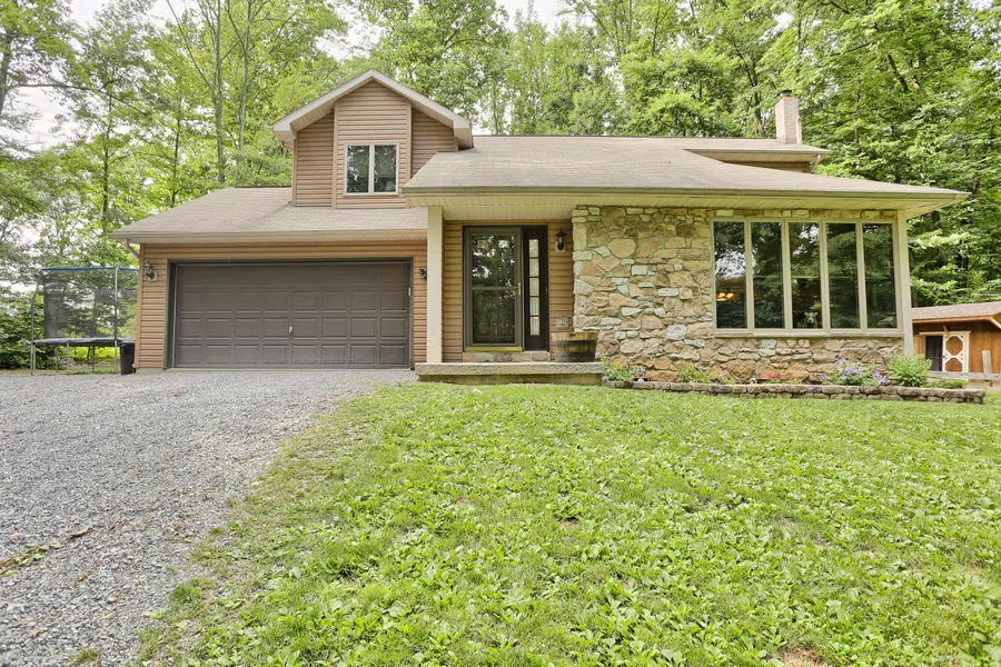 You will love coming home to your own piece of paradise in this beautiful 3 BR contemporary on 1.28 acre property. Nestled in tall trees, off the road, you will enjoy privacy while still being convenient to major roads to make your commute timesaving. The spacious vaulted ceiling give a grand entrance into living room with wrap around corner windows allowing for amazing light despite all the trees. Just imaging entertaining with the wonderfully equipped kitchen with granite countertops, stainless steel appliances and soap stone top island. Enjoy the peace and tranquility and breathe taking views of the woods and wildlife out back on the deck while sipping on our morning coffee. Hardwood floors in dining room, living room and hall add to the great flow of the home. Open stairs and hallway connect the master bedroom with ample closet space, the main bathroom right next to the master with another two bedrooms. The clean dry unfinished basement is ready and waiting for you to make it your own. Dont miss it! Please note: Shed and fencing for animals will be removed and area reseeded prior to settlement.
