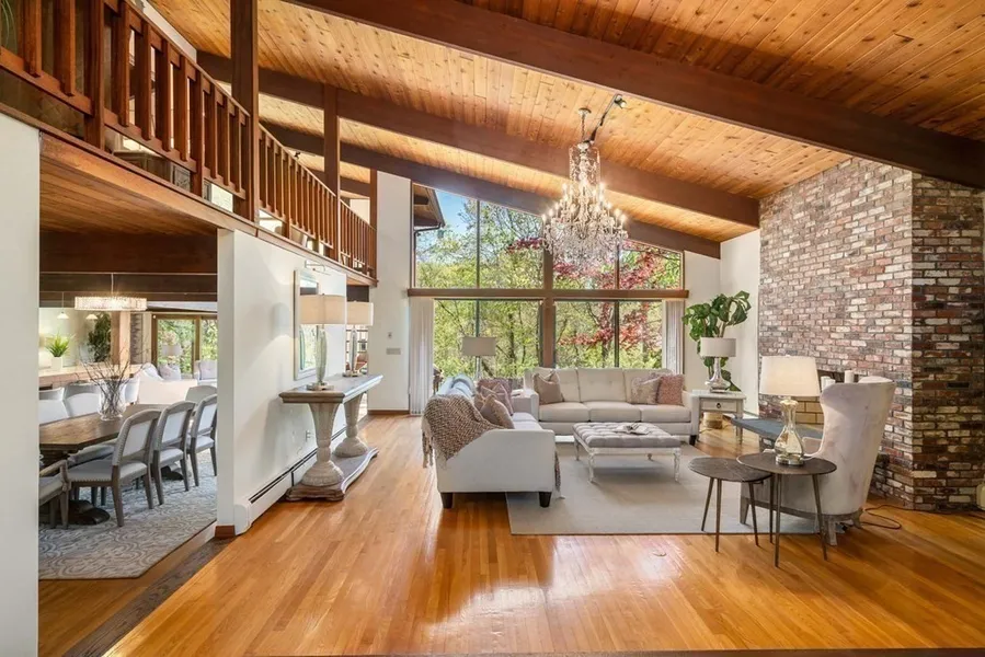 Dramatic contemporary style residence set in a south side location on a street with estate-like homes. Enjoy the feeling of privacy and surrounding nature on 1.24 acres abutting conservation land! This well-maintained home has a floor plan perfectly-suited for today's lifestyle. Further enhancing the interior are high ceilings, wood floors, and custom windows. The main level features an open, attractive two-story living room, an updated kitchen opening to a family room, and a lovely dining room perfect for entertaining. The second level is comprised of a primary bedroom with a walk-in closet, bathroom, and deck; three additional bedrooms; bathroom; and laundry area complete this floor. There is a finished basement with high ceilings. An attached two-garage plus a detached two-car garage offers the ideal scenario for the car enthusiast.