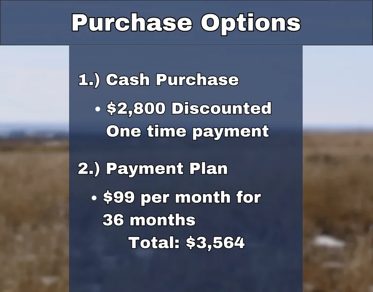 Your land-buying journey begins with a simple down payment of $99. With a term length of 36 months, you have the flexibility to choose your preferred due date each month for your payments. We aim to make the process of buying your dream property quick, stress-free, and easy.