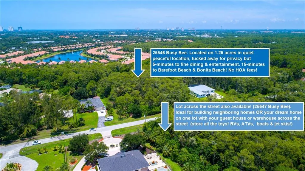 RARE OPPORTUNITY TO BUY A 1.25 ACRE LOT, IN COVETED SAN CARLOS ESTATES, WITH ANOTHER AVAILABLE STRAIGHT ACROSS THE STREET (MLS #221049380, 25547 BUSY BEE DR)! The opportunities are endless-- Ideal for groups who wish to build as neighbors OR for building your dream home on one lot and, just steps from your front door, your guest house OR warehouse/garage for all the toys (boats, RVs & ATVs). SAN CARLOS ESTATES HAS SEEN LOT SALES AS HIGH AS $275,000 & COMPLETED HOME SALES AS HIGH AS $1,495,000 IN 2021! Feel like you're "away from it all"-peaceful living nestled in a central location with easy access to US-41, Imperial Parkway and I-75. Perfectly located 2-minutes to the Promenade shopping & dining, less than 5 minutes to Coconut Point shopping & dining, 15 minutes to world class beaches & 20-minutes to RSW International Airport. Coveted Western exposure will grant you breathtaking sunsets...